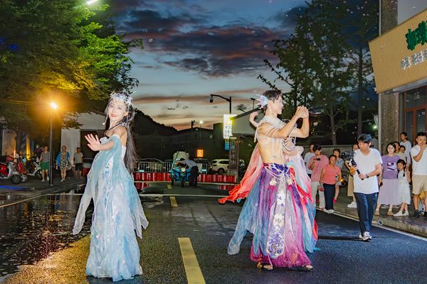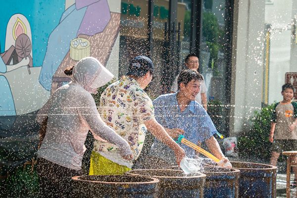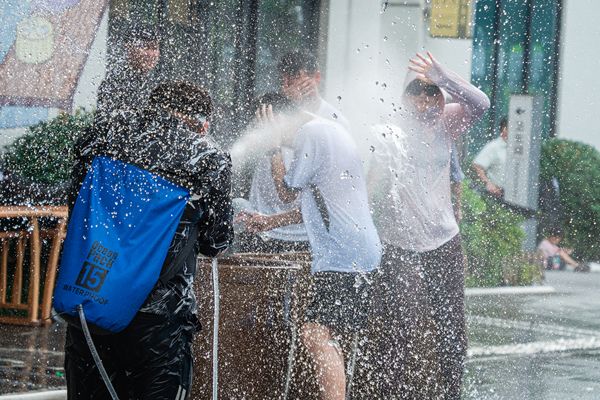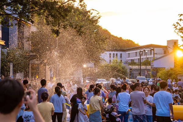2025年7月19日,浙江杭州余杭瓶窑老街,民众在水街上进行打水仗,在夕阳的映照下显得格外热闹。