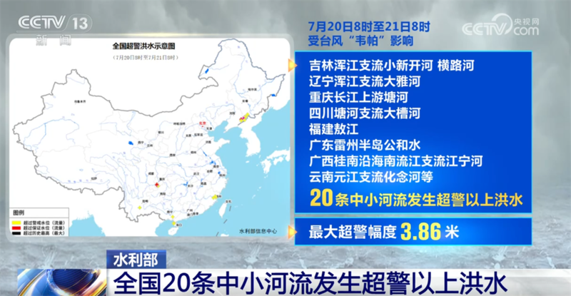 央视网消息:7月21日,水利部滚动会商研判全国雨水情形势,7月20日8时至21日8时,受台风“韦帕”影响,吉林浑江支流小新开河、横路河、辽宁浑江支流大雅河、重庆长江上游塘河、四川塘河支流大槽河、福建敖江、广东雷州半岛公和水、广西桂南沿海南流江支流江宁河、云南元江支流化念河等20条中小河流发生超警以上洪水,最大超警幅度3.86米,其中吉林小新开河及横路河、辽宁大雅河、重庆塘河、四川大槽河等5条中小河流超保0.06—1.80米。