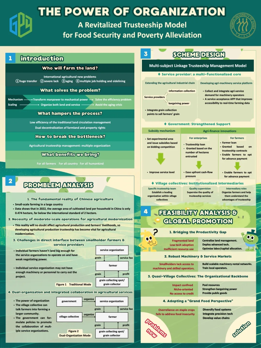 “我们想促进包括山地丘陵地区在内的农业用地服务规模化与机械化,助力实现农业现代化的目标。”针对土地撂荒问题,中国人民大学外国语学院何一尘团队创新提出“多主体联动农业生产托管模式”,通过整合土地、精准调动农机与农业金融工具,降低农业生产成本,提升亩产,提高农民收入。深入山西农村的扎实调研,为农业规模化提供了可复制、可推广的青年经验。