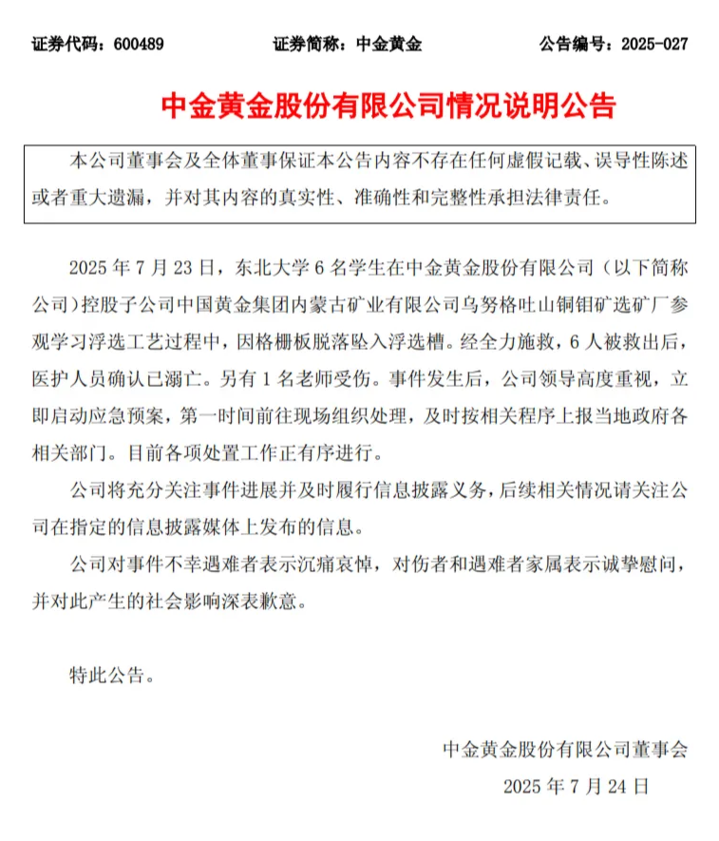 7月23日10时20分许,东北大学6名学生在中国黄金集团内蒙古矿业有限公司乌努格吐山铜钼矿选矿厂参观学习浮选工艺过程中,因格栅板脱落坠入浮选槽。经全力施救,6人被救出后,医护人员确认已溺亡。另有1名老师受伤。目前,属地党委政府、东北大学、中国黄金集团有限公司正在开展善后处置工作。