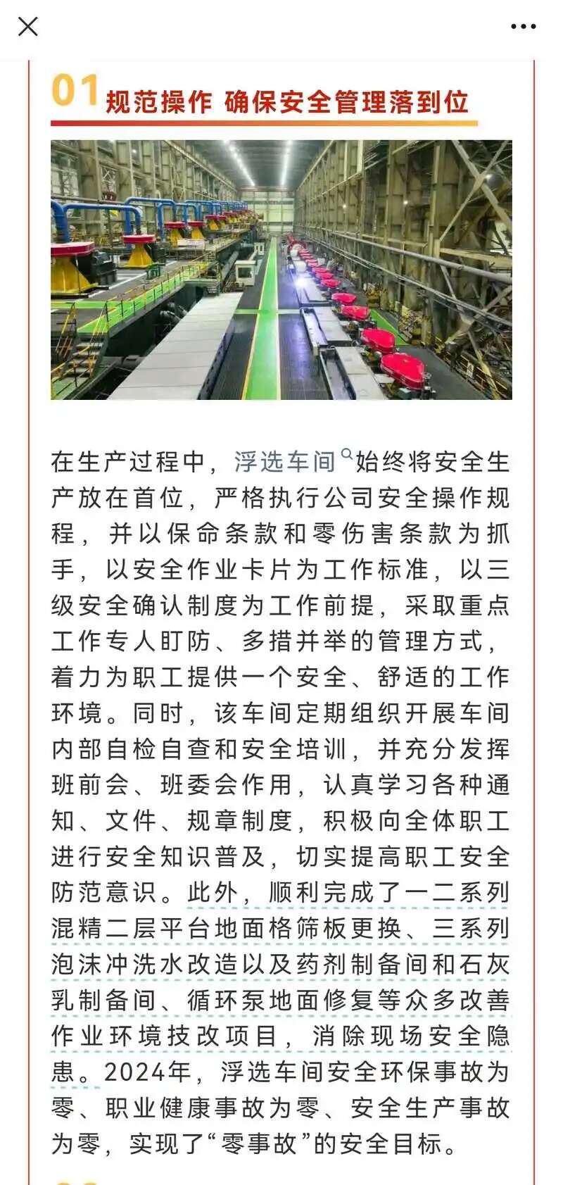 该公司曾在公众号文中这样表述:2024年,浮选车间安全环保事故为零、职业健康事故为零、安全生产事故为零,实现了“零事故”的安全目标。这份自信原该被一直延续,何以戛然而止?涉事公司的安全工作是否做到位也有待商榷。