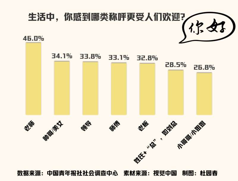 恰当的称谓是一次谈话、一场社交的良好开端。与人交往时,什么称谓最受欢迎?日前,中国青年报社社会调查中心联合问卷网(wenjuan.com),对1336名受访者进行的一项调查显示,“老师”“帅哥/美女”“领导”三类称呼最受欢迎。与不熟悉的人或陌生人打交道,84.1%的受访者会专门考虑一下对方的称谓问题。在人际交往中,90.1%的受访者感到恰当的称谓能拉近人与人之间的距离。