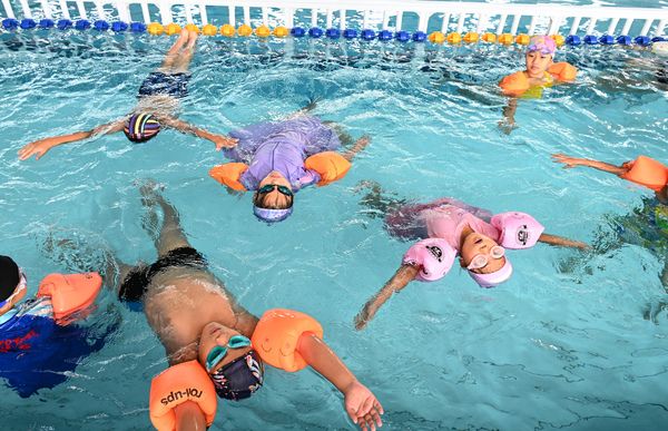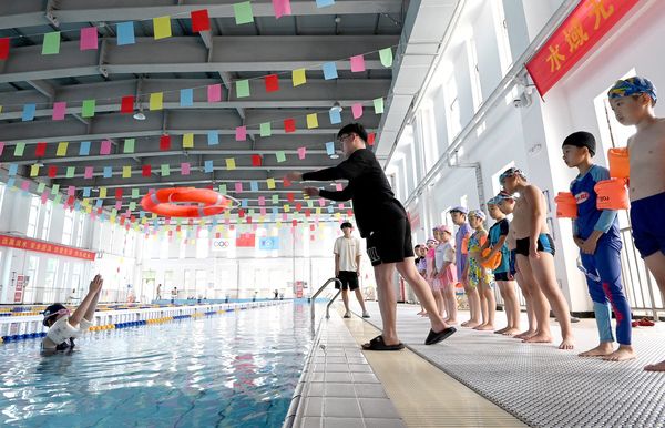 2025年7月24日,河北邯郸,防溺水游泳培训中心的教练在教学生们练习游泳。在7月25日“世界预防溺水日”前夕,河北省邯郸市防溺水游泳培训中心的暑期公益游泳班在仁合游泳馆开班,将为千余名青少年提供培训,旨在丰富广大青少年暑期生活,普及游泳技能,增强防溺水安全意识与自救互救能力,保障生命安全。