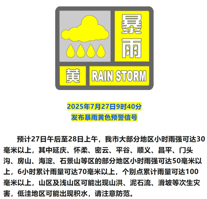 预计27-29日北京地区仍维持多雨态势,北京市气象台已于7月27日9时40分发布暴雨黄色预警信号。预计27日午后至28日上午,我市大部分地区小时雨强可达30毫米以上,延庆、怀柔、密云、平谷、顺义、昌平、门头沟、房山、海淀、石景山等区的部分地区小时雨强可达50毫米以上,6小时累计雨量可达70毫米以上,个别点累计雨量可达100毫米以上,山区及浅山区出现山洪、泥石流、滑坡等次生灾害风险高,低洼地区易出现积水,需高度关注并注意防范。