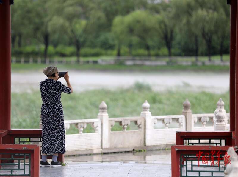 7月28日,北京市密云区,白河河面雾气升腾,一位市民在白河公园的亭子里拍照。中青报·中青网记者 陈剑/摄