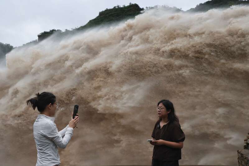 黄松峪水库的溢流口,库水奔涌而出,激起了浓密的水雾。昨夜,平谷区最大降雨站点位于水库上游的黄松峪乡梨树沟,达到了约230毫米。因此从凌晨的2时到5时,水务部门一直在根据来水量调整泄水作业。