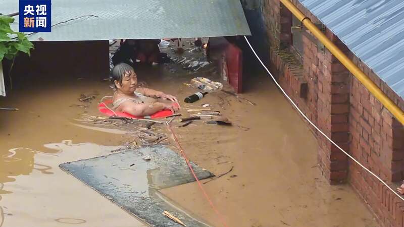 在蓟州区下营镇下营村,一位老人被困家中。为躲避不断上涨的洪水,只能紧抓窗户外的护栏等待救援,情况十分危险。