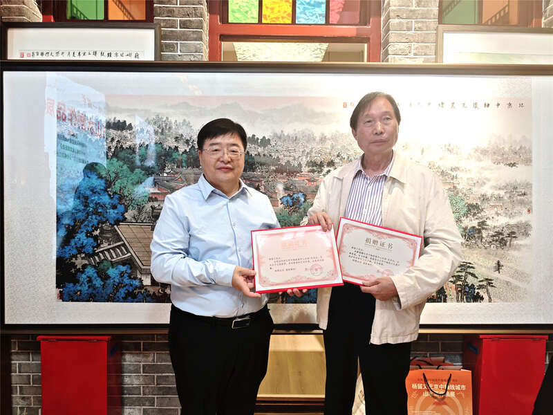 杨留义(右)向北京京企中轴线保护公益基金会捐赠作品《北京中轴线先农坛》。主办方供图