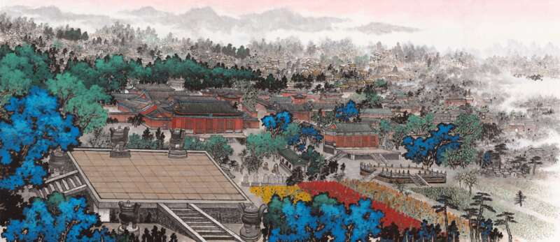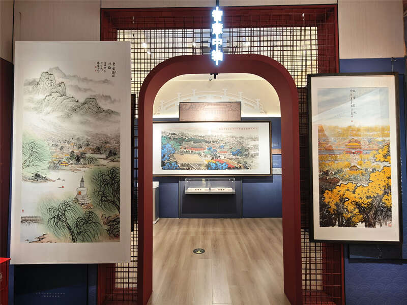 展览呈现了著名画家、北京城市山水画研究会会长杨留义,以北京中轴线15处核心遗产要素及其周边重要历史文化景观为主题,创作的城市山水画作品。他将巍峨的宫殿群、庄严的礼仪空间、古朴的坛庙建筑以及市井烟火气,巧妙地融汇于丹青画卷之中。