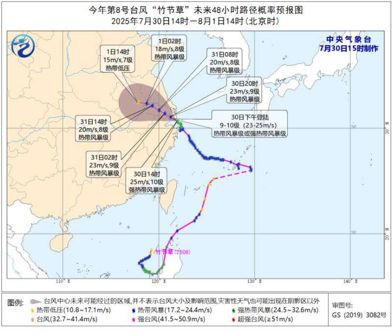 7月27日晚上,今年第8号台风“草”减弱后的低压环流再度发展,又一次加强为台风(热带风暴级,18米/秒)。按照惯例,它将继续沿用原台风名称和编号。7月30日4时30分前后,“竹节草”(热带风暴级)在浙江省舟山市朱家尖岛沿海登陆,9时加强为强热带风暴级,预计30日傍晚前后还将在浙平湖到江苏启东一带沿海再次登陆,登陆后强度逐渐减弱。
