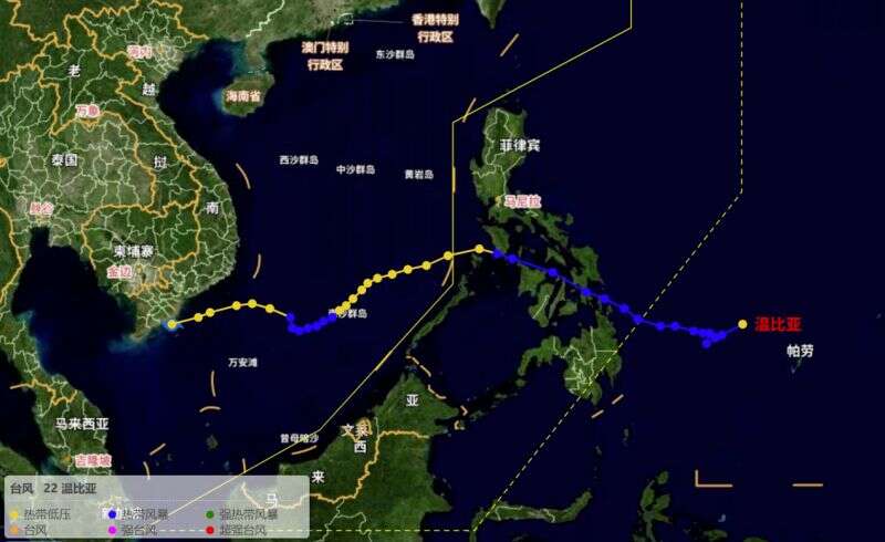 2000年第22号台风“温比亚”,生命周期短暂,是2000年台风季中影响较弱的成员之一,但在其发展过程中经历从热带风暴减弱为热带低压后再次增强的过程。