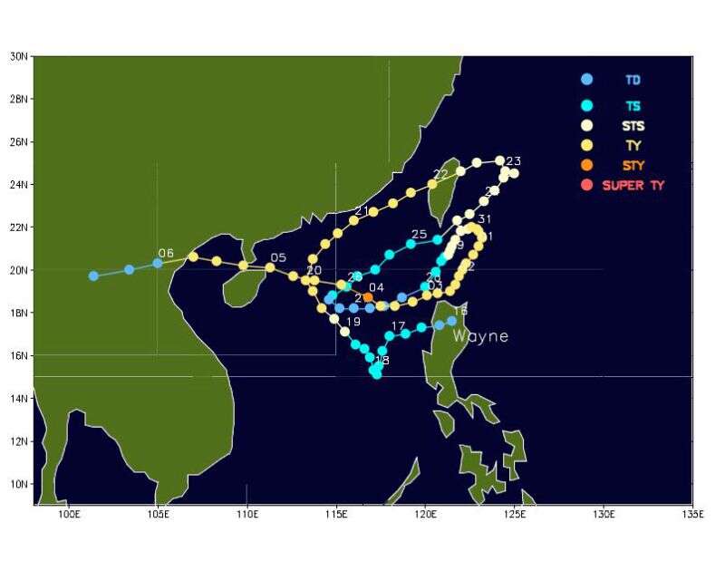 1986年的第16号台风“韦恩”,在登陆我国台湾岛之后,曾一度减弱为热带低压,随后又加强为台风,再次以台风级别登陆广东雷州半岛。其路径发生了五次显著转变,其中包括四次180度转向,为路径最复杂台风之一。