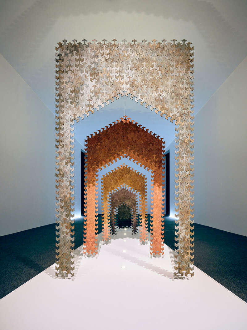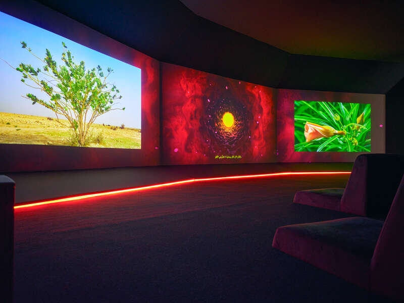 自20世纪50至70年代现代主义绘画发轫,到如今摄影、影像、装置、绘画等多元媒介的绽放,材料的演变本身就是一部微缩的文明史。沙漠的细沙被封存在树脂中,成为时间的琥珀;传统阿拉伯书法的线条挣脱纸面,在光影装置里幻化为跨越时空的符号。