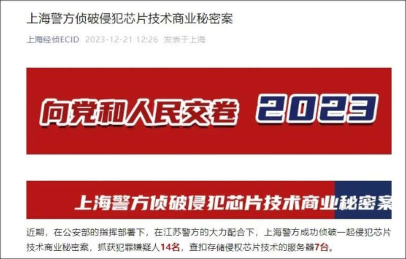 观察者网注意到,2023年12月21日,上海市公安局经济犯罪侦查总队公众号“上海经侦ECID”曾发布通报称,近期,在公安部的指挥部署下,在江苏警方的大力配合下,上海警方成功侦破一起侵犯芯片技术商业秘密案,抓获犯罪嫌疑人14名,查扣存储侵权芯片技术的服务器7台。