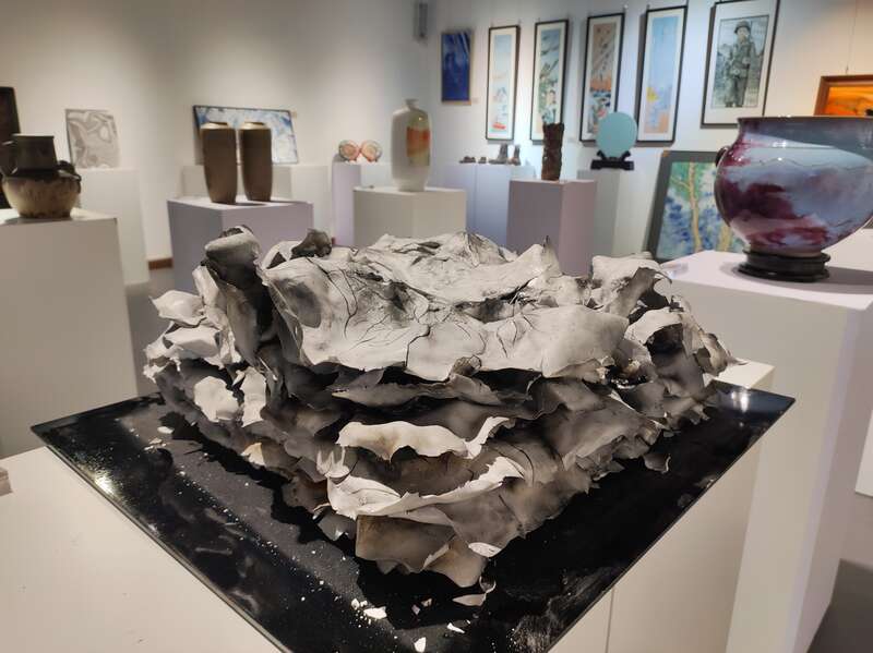 “‘胜利与和平’——纪念中国人民抗日战争暨世界反法西斯战争胜利80周年主题创作陶瓷艺术展”,8月1日在北京陶瓷艺术馆开幕。图为《绽放》,类似书本的造型,里面的种种痕迹,提醒我们不可忘记的一切。中青报·中青网记者 蒋肖斌/摄