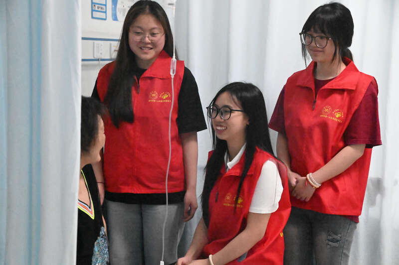 王京、黄泽轩、薛思思、王颖等4位医务社工实习生,从今年暑假开始在郴州市第一人民医院西院安宁疗护中心实习四个月。她们穿着社工“红马甲”穿梭病房间,给癌症晚期患者和家属提供心理支持。