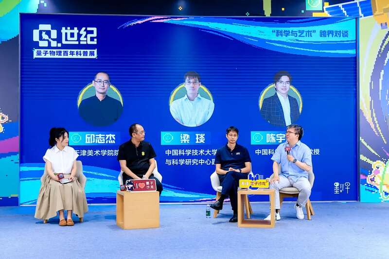 在“科学x艺术”跨界对话环节,邱志杰和中国科学技术大学教授梁琰、中国科学技术大学教授陈宇翱围绕“量子科学与艺术表达”的主题展开探讨。