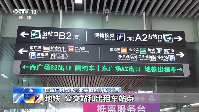 国铁广州局深圳北站值班站长 刘慧:我们在车站配备了指示线路的电子指示屏和地面流线,旅客根据这些提示性的设置,很容易就能找到地铁、公交站和出租车站点。