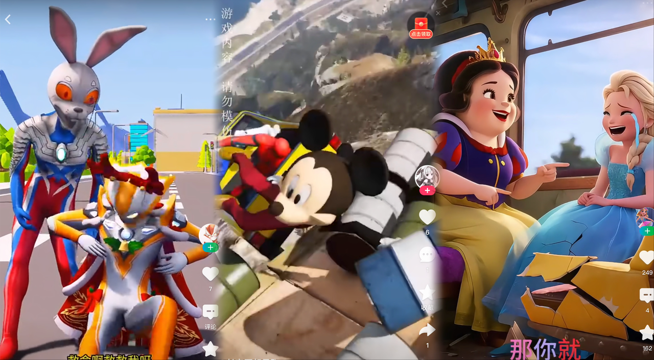 “白雪公主霸凌艾莎” “米奇在山顶脚踹蜘蛛侠”“兔头面具奥特曼打晕绑架小奥特曼”……