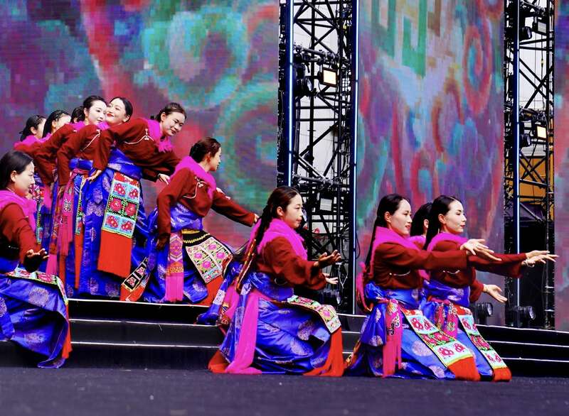 8月9日,青海省海南藏族自治州,2025年藏族服饰文化艺术节,演员们在表演传统舞蹈。赵树宴/摄