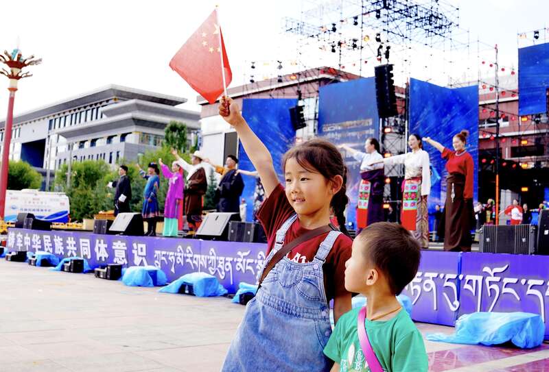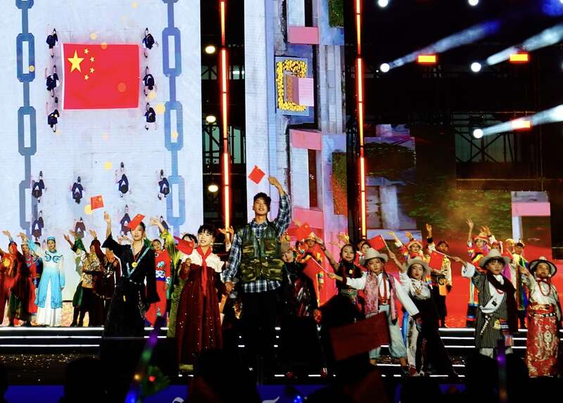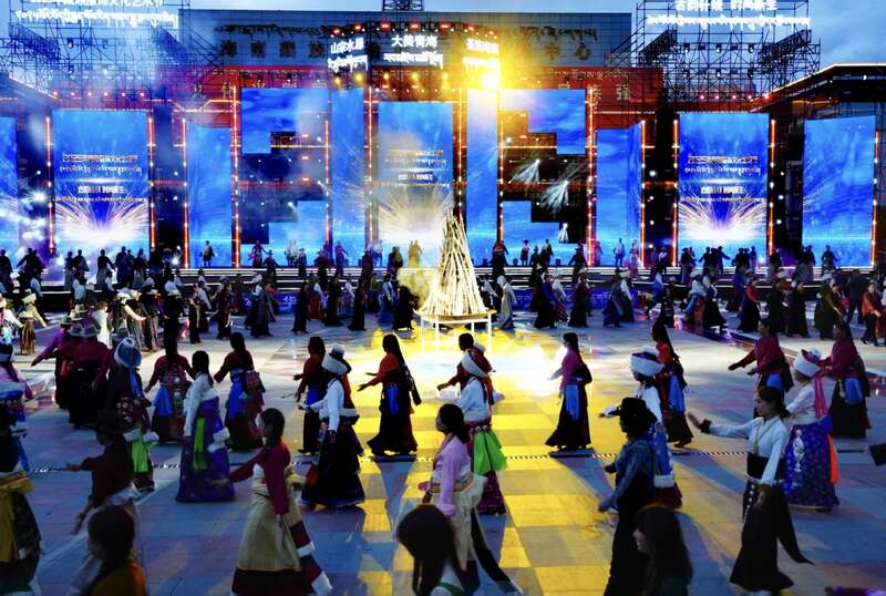 8月9日,青海省海南藏族自治州,一场千人锅庄舞盛会现场。8月8日至8月12日,“古韵针线·时尚新生”2025年藏族服饰文化艺术节在青海省海南藏族自治州举行,演员们身着精美藏族服饰,以舞蹈、音乐、走秀等形式,生动演绎藏族人民的生活变迁与文化传承,为观众带来一场融合传统与现代的藏族服饰文化体验。赵树宴/摄