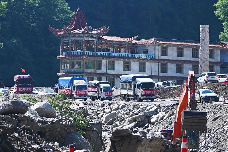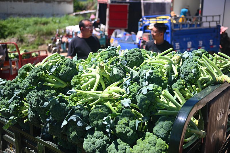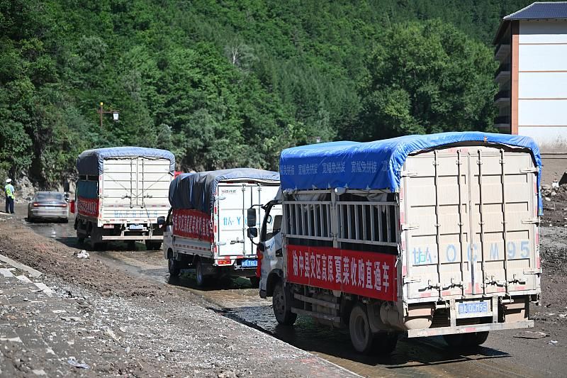 2025年8月13日,航拍甘肃省兰州市榆中县山洪受灾路段。随着榆中县山洪灾害损毁道路通行条件进一步改善,当地农业农村部门积极行动,组织蔬菜经销商前往受灾村设立“蔬菜快速收购点”,收购当地农户种植的西兰花等高原夏菜,公安部门也为高原夏菜收购直通车开辟了“绿色通道”,当日预计收购蔬菜20万斤以上,基本可以解决蔬菜滞销等问题,帮助大家尽快恢复生产生活。(无人机照片) 中新社记者 李亚龙 摄