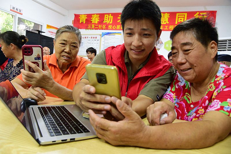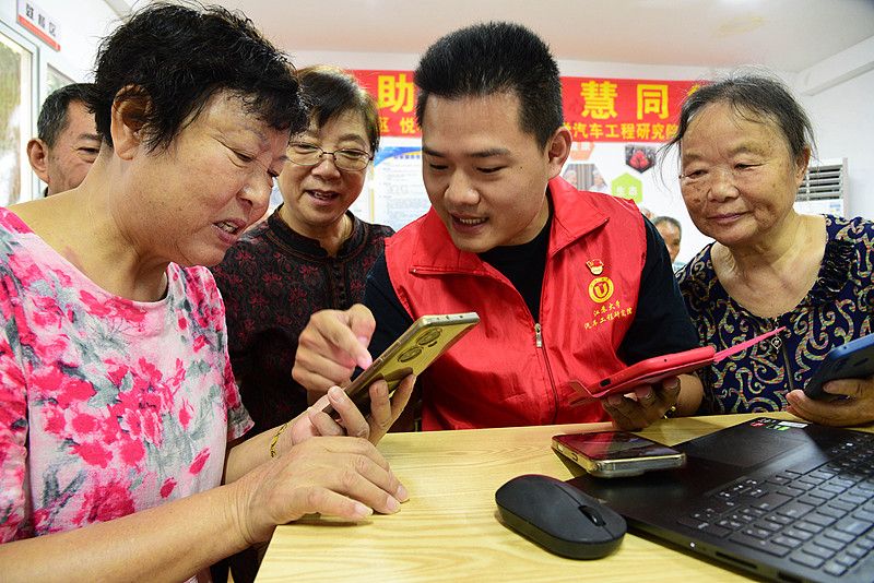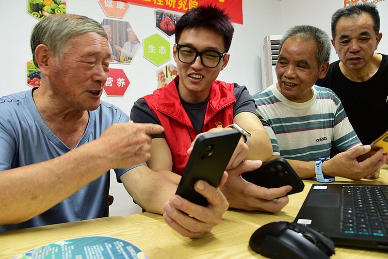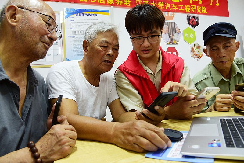 2025年8月14日,江苏镇江,江苏大学党员志愿者来到镇江市和平路街道三茅宫第二社区,开展“青春助老 智慧同行”主题党日活动,为老年居民开设智慧小课堂,指导他们学习网上购物、抖音使用、豆包智能、防网络诈骗等知识与技能,帮助老年人乐享智慧生活。