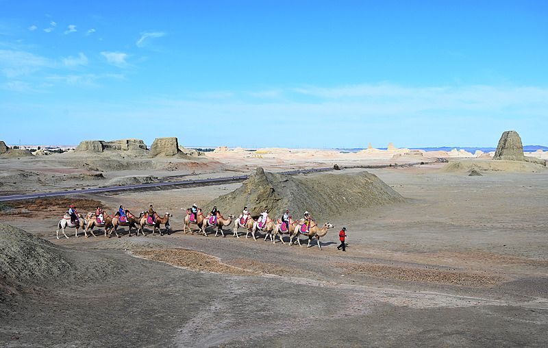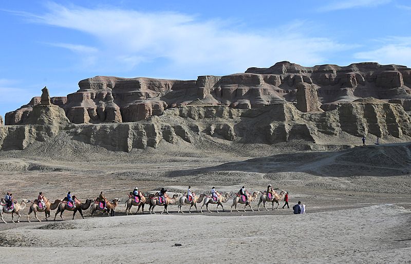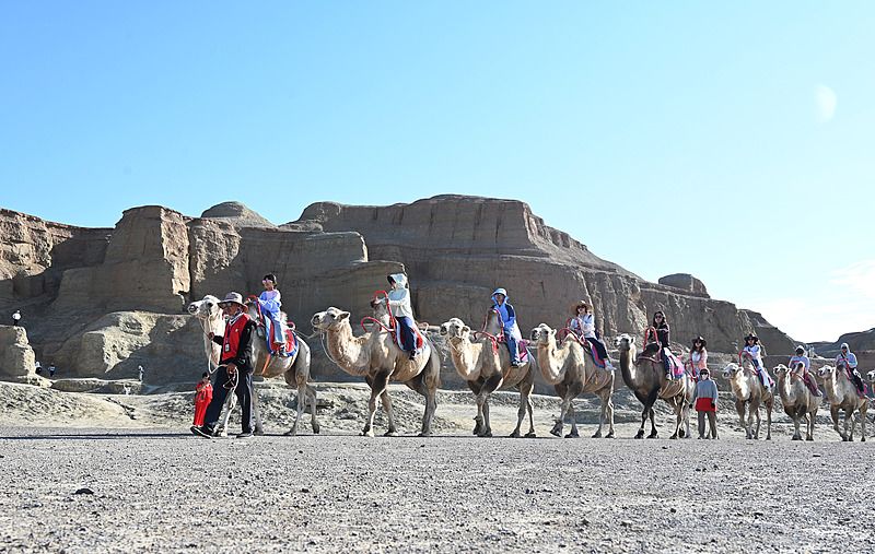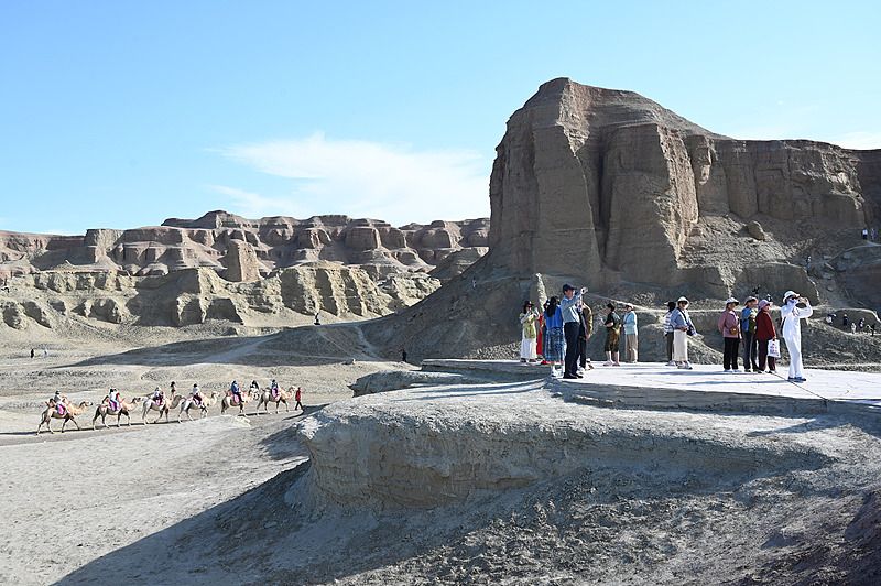2025年8月14日,新疆维吾尔自治区克拉玛依市乌尔禾区,游人骑着骆驼游览世界魔鬼城。