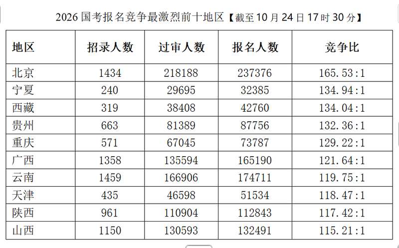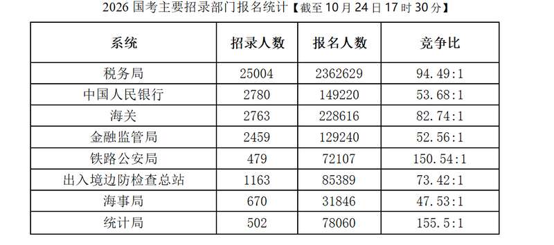 10月24日是2026年国考报名最后一天,2026年国考共招录38119人、20714个职位,根据中公教育提供的数据,截至10月24日17时30分,2026国考报名总人数达3515251人,与去年同期相比增加近26万人,创历史新高。其中3207060人已通过招录单位审核,平均竞争比为92:1。