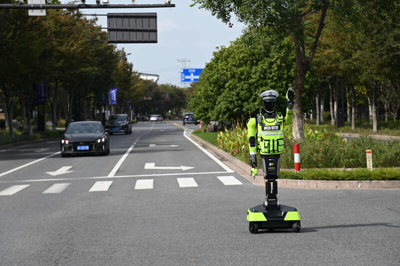 在乌镇云享路与智程路交叉口,一名“特殊交警”、交通指挥机器人正以标准手势引导车流。机器人身高1.8米,续航时间超7小时。它不仅能完成各类指挥动作,还可与信号灯系统联动,实现动态分流与智能劝导。