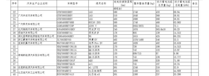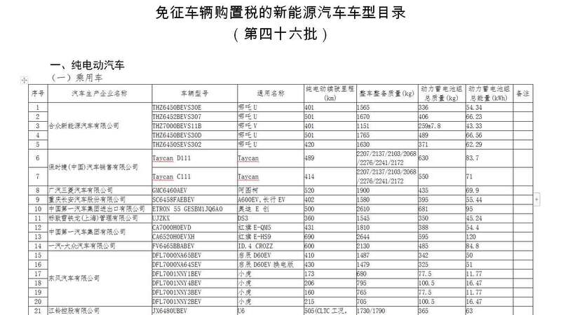 《免征车辆购置税的新能源汽车车型目录》(第四十六批)显示,纯电动汽车中,乘用车包括合众新能源汽车有限公司哪吒U、哪吒V共5款车型,保时捷(中国)汽车销售有限公司2款Taycan车型,中国第一汽车集团进出口有限公司奥迪E创1款车型,中国第一汽车集团有限公司红旗E-QM5、红旗E-HS9共2款车型,标致雪铁龙(上海)管理有限公司DS3的1款车型,奇瑞新能源汽车股份有限公司QQ冰淇淋、eQ5、ec1共6款车型,比亚迪汽车工业有限公司比亚迪海豚、比亚迪e3共2款车型等。