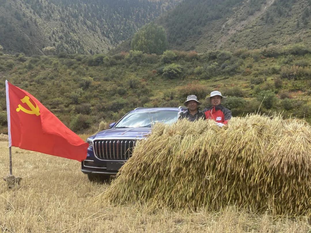 自2002年起,中国一汽先后对口支援昌都市左贡县和芒康县。19年来,中国一汽共派出7批17名援藏干部人才,同时累计投入资金超两亿元,在基础设施建设、特色产业发展、医疗卫生、教育事业等领域开展了130多个帮扶项目。图为一汽援藏干部与村民共迎青稞收获。