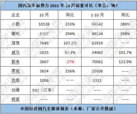 在新能源车市场呈现爆发式增长的背景下,你永远想不到下一个造车的会是谁。而那些较早入局的新势力们,如今正在智能电动汽车的赛道上比拼销量。数据显示,10月,小鹏、哪吒、理想、威马、蔚来、零跑和岚图的销量分别为10138辆、8107辆、7649辆、5025辆、3667辆、3654辆、1006辆。