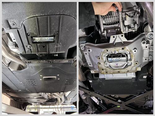 左为3月8日普陀4S店装好挡板,右为3月9日中午浦东4S店拆开档板后的车底照片。 消费者 供图
