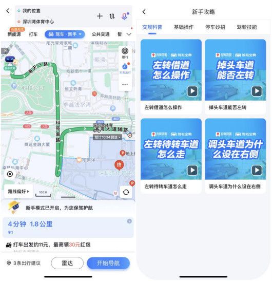 考虑到新手司机驾驶经验不足等问题,百度地图还在最新版本中贴心上线了“新手攻略”专区,高度还原真实驾车场景,帮助新手司机在出发前做好准备。在新手导航模式下,用户可在出发前,点击路线规划页面左上角的“新手攻略”图标,即可快速查看交规讲解、驾驶技巧、基础操作等相关视频或图文攻略,学习行车知识,助力安全驾驶。