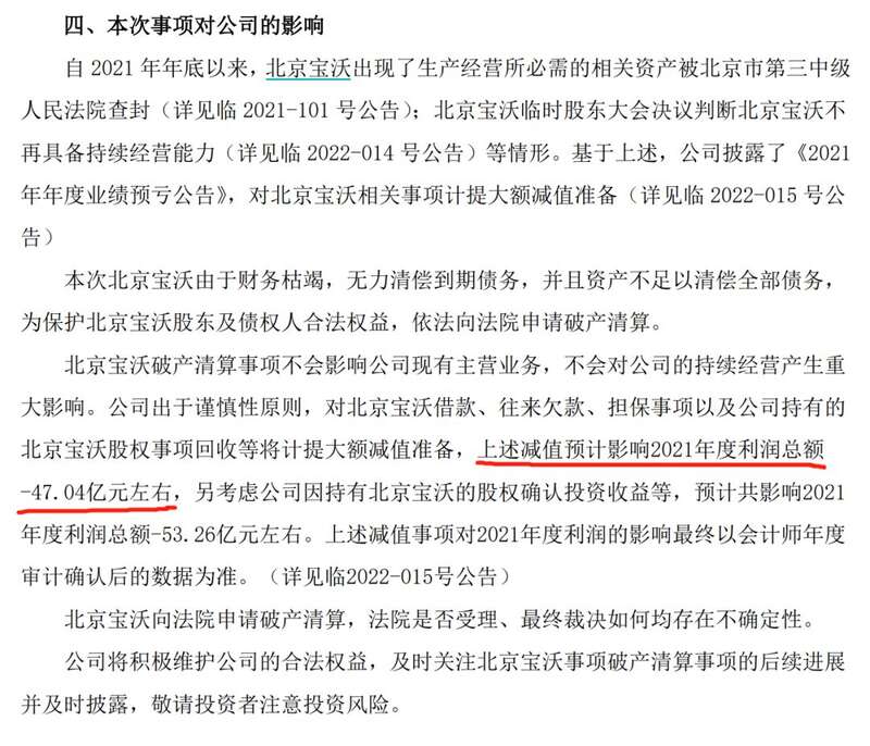 福田汽车方面表示,北京宝沃破产清算事项不会影响公司现有主营业务,不会对公司的持续经营产生重大影响。但出于谨慎性原则,福田汽车对北京宝沃相关事项计提大额减值准备,预计影响其2021年度利润总额-47.04亿元左右,另考虑公司因持有北京宝沃的股权确认投资收益等,预计共影响2021年度利润总额-53.26亿元左右。