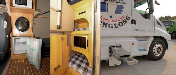 在这款乘龙T7房车内,专门配备了1.4米的豪华大床,还搭载了厨房、冰箱、洗衣机、电磁炉等生活设施,卡车司机不用下车也可以睡上一个好觉,吃上热乎饭。