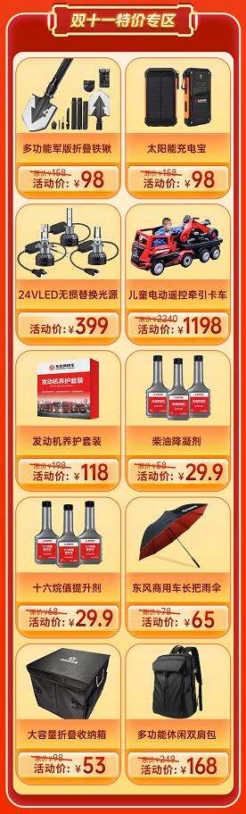 除了特价补贴车型外,东风商用车此次活动真正做到了“尖端好物、神仙价格”,开设了秒杀专区和特价商品专区。超值秒杀商品低至9.9元,总有一款让你心动,秒杀商品数量有限,先抢先得。没有抢到秒杀商品的客户也无需着急,特价专区同样有大量实惠好物,如发动机养护套装、柴油降凝剂、十六烷值提升剂等卡友必备的商品,活动期间,都将以“冰点价”发售,只为让卡友们能享受到真正的实惠。