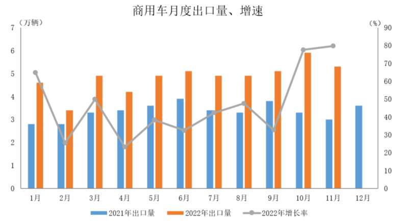 2022年11月,商用车出口5.3万辆,环比下降9.5%,同比增长79.7%。2022年1-11月,商用车出口53.3万辆,同比增长45.7%。