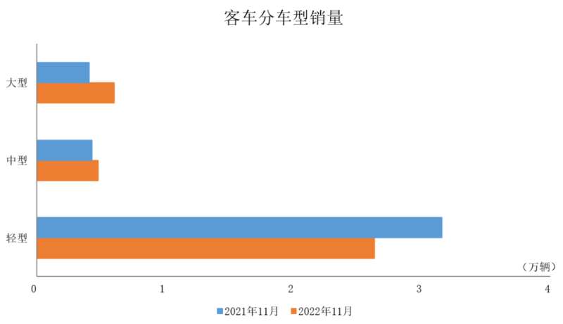 2022年1-11月,客车产销同比均呈较快下降。与上年同期相比,大型客车产销小幅增长,中型客车和轻型客车产销呈现两位数下降。(中汽协数据)
