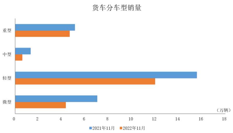 2022年11月,与上月相比,货车产销均呈下降;与上年同期相比,货车产销均呈明显下降。在货车细分品种中,与上月相比,四大类货车品种产销均呈不同程度下降,其中微型货车产销降幅更为明显;与上年同期相比,四大类货车品种产销均呈现下降,除重型货车销量小幅下降外,其余均呈两位数下降。