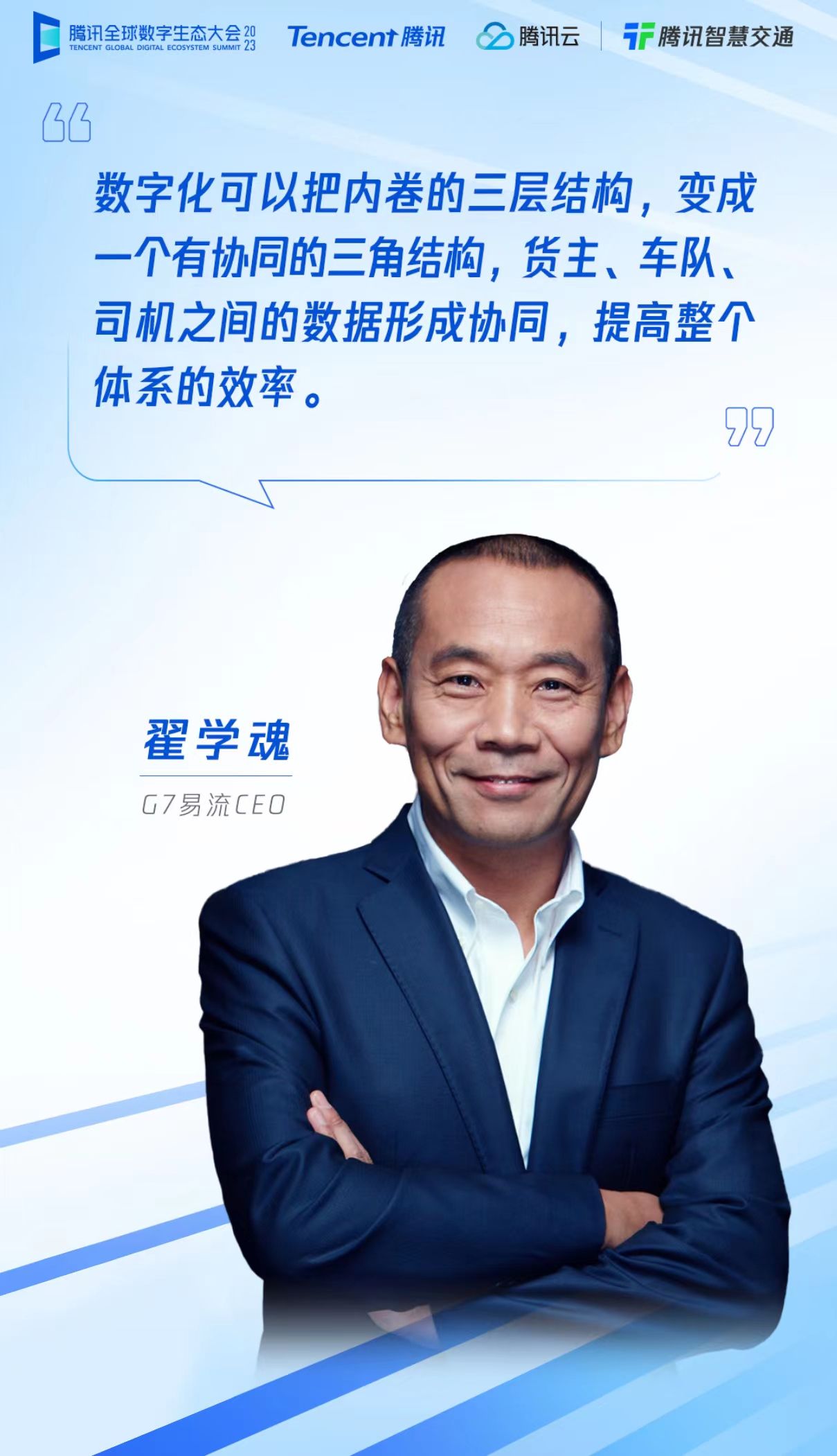 9月8日,2023腾讯全球数字生态大会智慧交通专场在深圳举行。G7易流CEO翟学魂发表了题为《物流数字化探索与实践》的主题演讲。