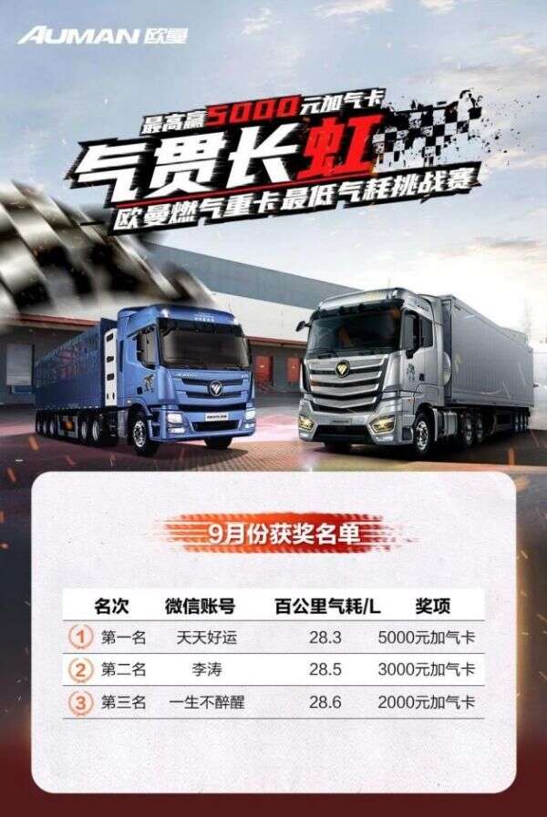 中秋已过,临近年底,货运行业进入忙碌阶段,又到了考验重卡的关键时候。为了保证欧曼燃气重卡在全天候的运输场景中最客观地展现气耗数据。欧曼最低气耗挑战赛将持续进行到12月底, 山东、山西、河北、河南、内蒙古、宁夏地区的欧曼燃气重卡卡友可以尽情参与挑战,与广大“省气”老司机一较高下,展露运输风采,还有大奖等你来拿!参与方式如下(资料上传提示:朋友圈截图+仪表盘照片+行驶本照片+官方账号私信图片+客户手机号):