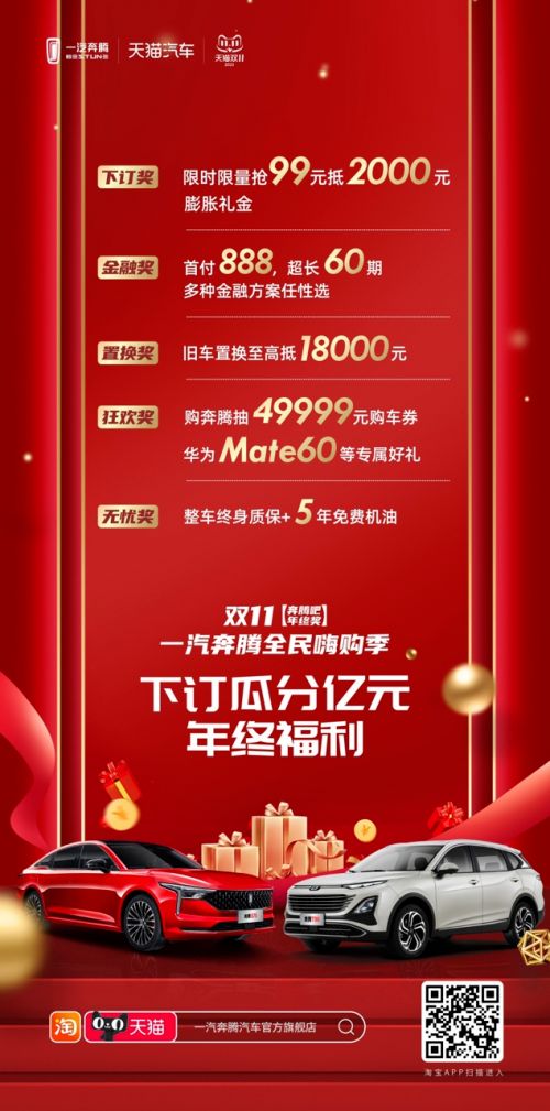 在11月7日-11月15日期间,一汽奔腾还将联动10城高铁候车大屏和天猫校园超百所高校700块电子大屏投放“奔腾年终奖”!只要打开淘宝扫码关注店铺,就能领取红包,参与瓜分亿元福利!为赶车的你、赶考的你,送上一汽奔腾满满的爱与诚意!