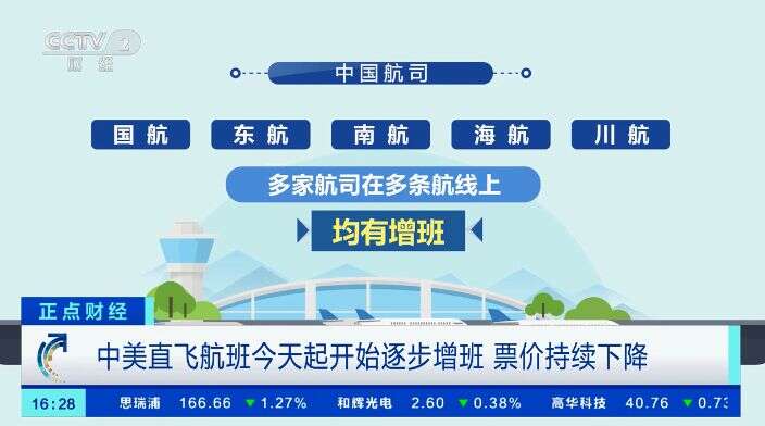 中国航司中,国航、东航、南航、海航、川航,多家航司在多条航线上均有增班。美方航司方面,2023年11月起美联航计划在旧金山-北京-旧金山航线上增加每周4班;美国航空也计划从2024年1月起在达拉斯-上海-达拉斯航线上增加每周3班。