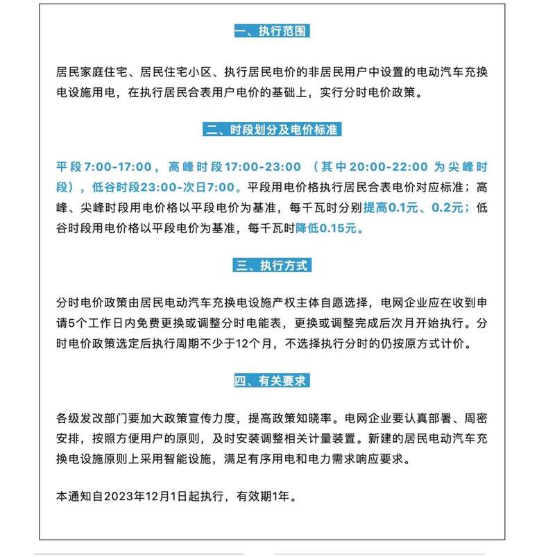 居民家庭住宅、居民住宅小区、执行居民电价的非居民用户中设置的电动汽车充换电设施用电,在执行居民合表用户电价的基础上,实行分时电价政策。 时间分段为平段7:00-17:00,高峰时段17:00-23:00 (其中20:00-22:00 为尖峰时段),低谷时段23:00-次日7:00。