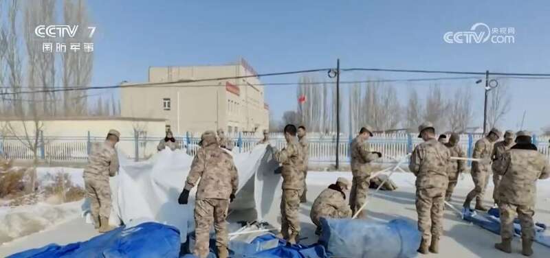 新疆军区某合成团派出兵力分赴不同乡镇,帮助检查房屋受损情况,为村民搭建帐篷,保障村民吃饭、住宿、看病、保暖等问题。