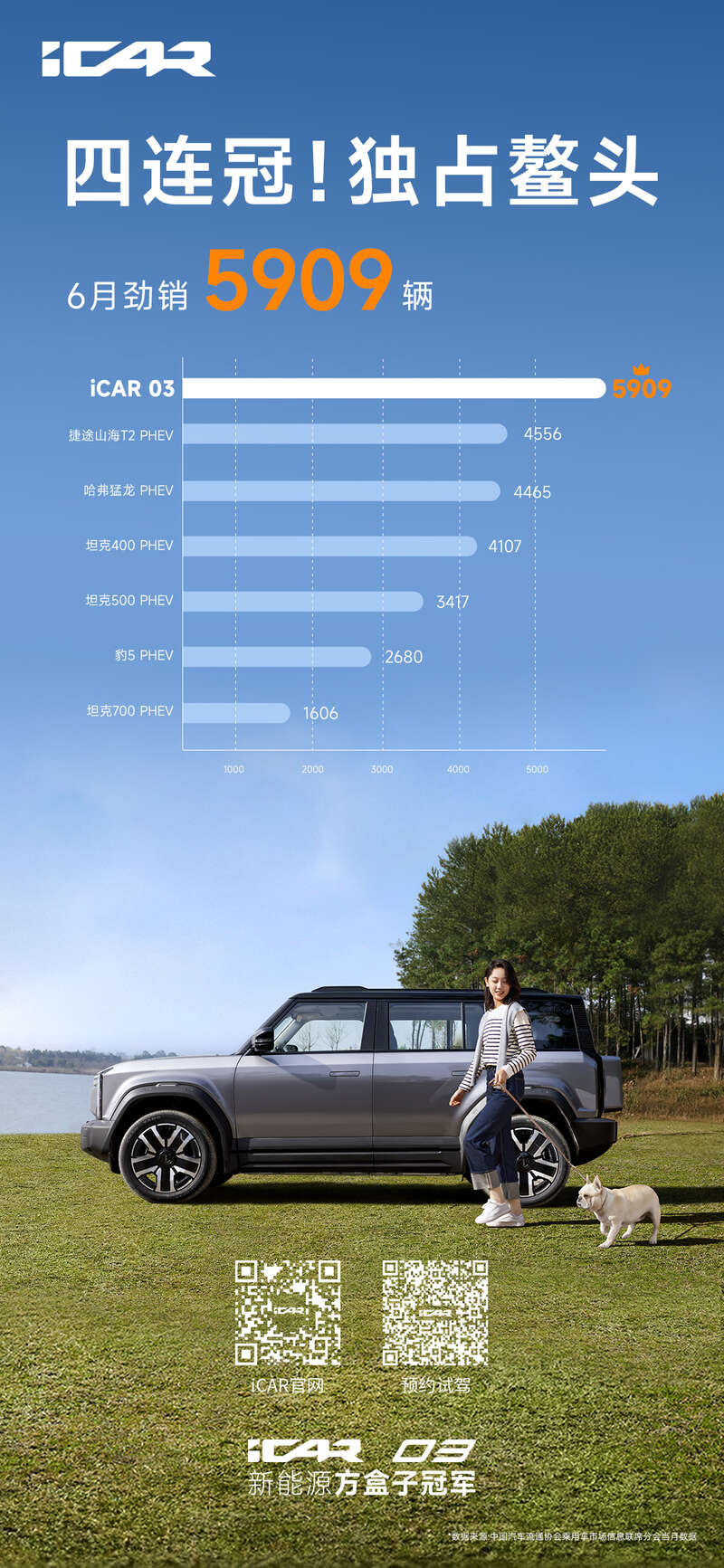 日前,据乘联会数据显示,iCAR品牌首款产品iCAR 03六月劲销5909辆,勇夺四连冠,以独占鳌头之势领跑新能源方盒子领域。作为一款全铝电四驱SUV领潮者,iCAR 03自上市以来凭借潮流方盒子、超预期操控和智能平权为广大年轻用户打造高价值纯电出行体验,实力圈粉,人气和销量更是居高不下,持续霸榜,深受年轻人的青睐与认可,成为他们心中的爆款时尚大单品。而iCAR 03的火爆盛况,不仅展现了其硬核出色的产品实力,更有力证明了iCAR“年轻人的车”的品牌定位的前瞻性和精准性,为品牌进一步向前向上发展提供强大势能。