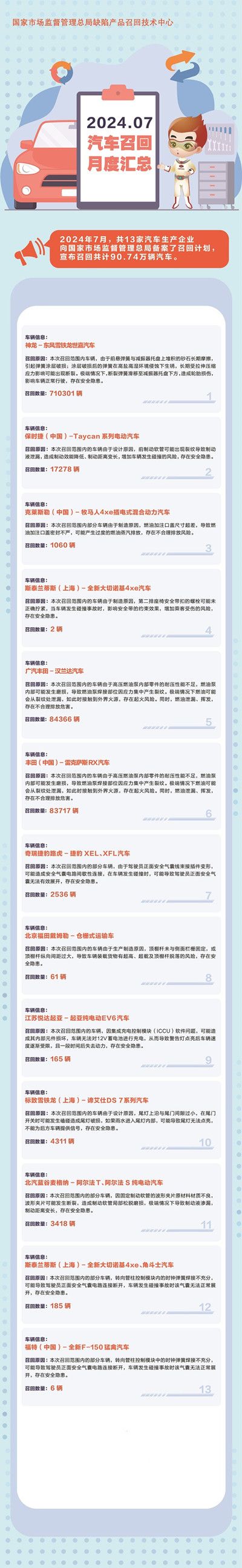 中新经纬8月9日电 国家市场监管总局9日发布《2024年7月汽车召回月度汇总》称,2024年7月,共13家汽车生产企业向国家市场监督管理总局备案了召回计划,宣布召回共计90.74万辆汽车。其中,71.03万辆东风雪铁龙世嘉汽车被召回,占比接近八成。召回信息显示,本次召回范围内车辆,由于前悬弹簧与减振器托盘上堆积的砂石长期摩擦,引起弹簧涂层破损;涂层破损后的弹簧在高盐高湿环境侵蚀下生锈,长期受拉伸压缩应力影响可能出现断裂。极端情况下,断裂弹簧滑移至减振器托盘下方,造成轮胎损伤,影响车辆正常行驶,存在安全隐患。