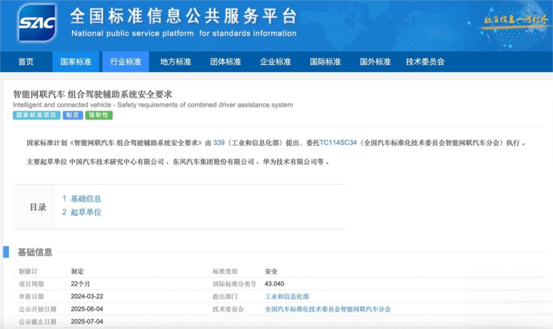 6月4日,全国标准信息公共服务平台公示《智能网联汽车组合驾驶辅助系统安全要求》拟立项强制性国家标准项目意见的通知。该国家标准计划由工业和信息化部提出,委托全国汽车标准化技术委员会智能网联汽车分会执行。主要起草单位包括中国汽车技术研究中心有限公司、东风汽车集团股份有限公司、华为技术有限公司等。